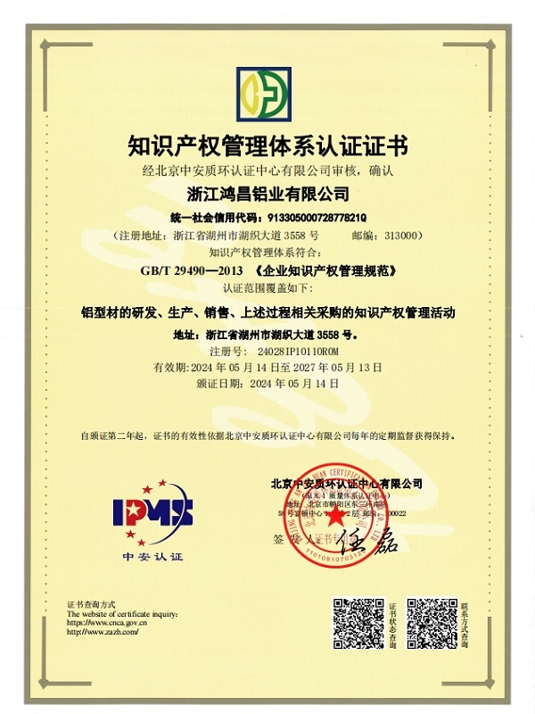 知识产权管理体系认证证书 质量管理体系认证证书 环境管理体系认证证书 高新技术企业证书 职业健康安全管理体系认证证书 能源管理体系认证证书 浙江省AAA级“守合同重信用”公示企业 鸿昕系统商标注册证 鸿昕系统商标注册证 中国绿色建材产品认证证书-铝合金建筑型材(喷粉型材) 中国绿色建材产品认证证书-浇注式隔热铝合金建筑型材 中国绿色建材产品认证证书-穿条式隔热铝合金建筑型材 1 2 3 >